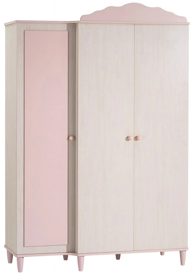 Trojdverová šatníková skriňa v originálnej farebnej kombinácii dekoru brezy a ružovej farby zaujme hneď na prvý pohľad. Ozvláštnenie vlnitou strieškou jej dodáva exkluzívny vzhľad. Veľkou výhodou je integrované LED osvetlenie, ktoré sa nachádza v dvojdverovej časti. Soft close je u tohto produktu samozrejmosťou, teda sa nemusíte báť, že si dieťa priškripne prstami medzi dvere alebo si nejako inak ublíži. Jednodverovú časť je možné nainštalovať ako napravo, tak naľavo, aby produkt čo najviac vyhovoval Vašim domácim podmienkam. Vysoké nôžky oceníte z hľadiska upratovania, ľahko sa pod ne dostane aj robotický vysávač.