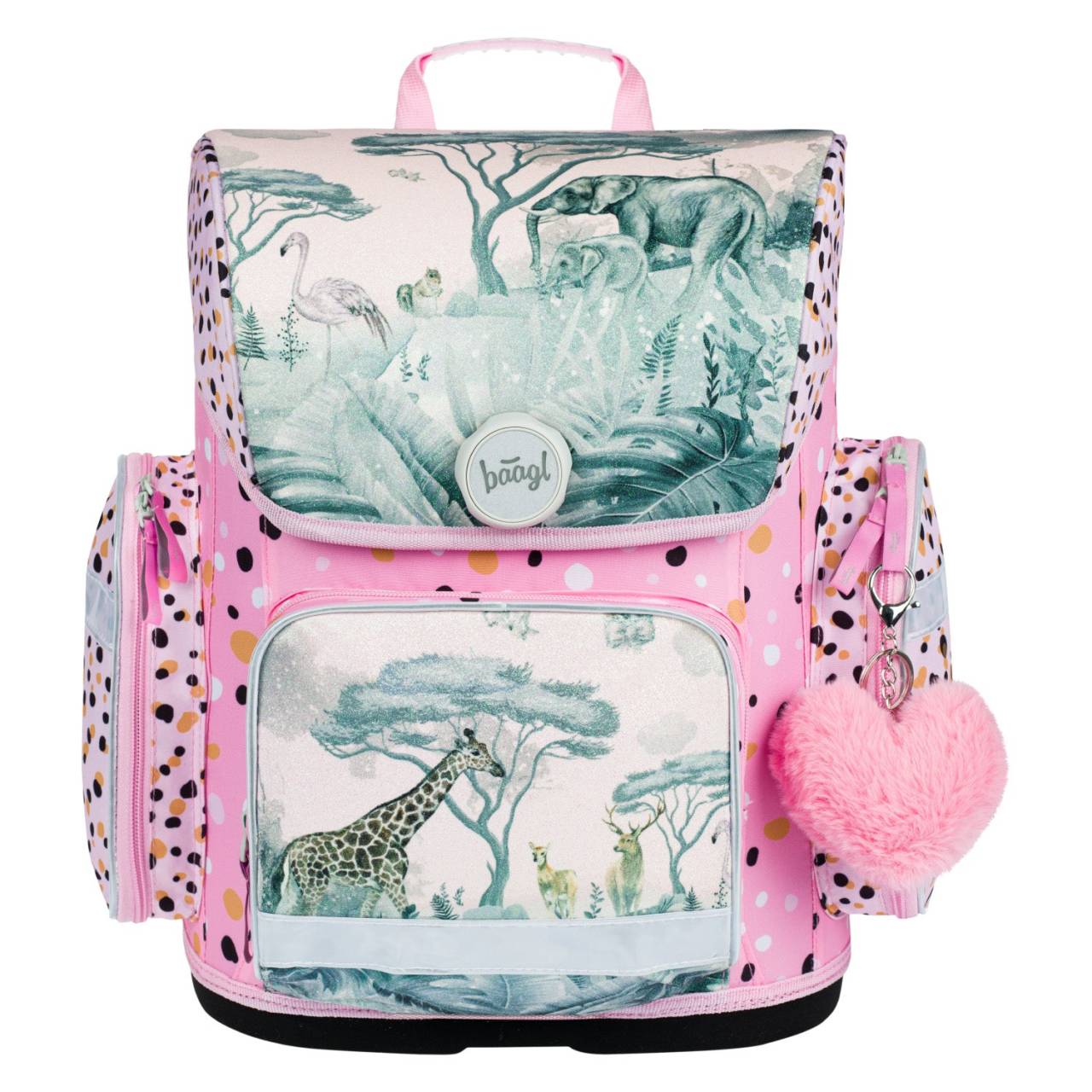 Školská aktovka Ergo Safari. Nežne ružová aktovka Ergo s motívom Safari, doplnená o trblietavé detaily. Aktovka je vhodná od prvej triedy základnej školy.