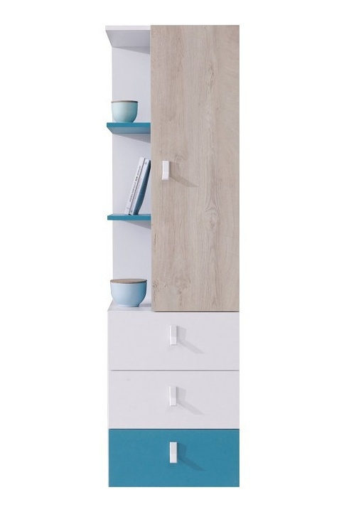 Regál nízky s šuflíky saturn - modrý / biely / dub. Veľmi elegantný regál nielen pre náročných študentov. Jednoduché a praktické usporiadanie umožňuje zdôrazniť ozdobné predmety a skryť tajnosti. Môžete doň ukladať stohy papierov, knihy aj drobné oblečenie.