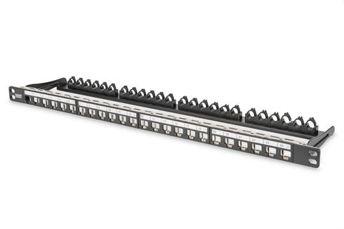 DIGITUS 19" modulárny patch panel 24port 0,5U vhodný pre UTP i STP keystony, čierny RAL9005. Modular Patch Panel, shielded, 24-port label field, 0.5U, rack mount, black RAL 9005