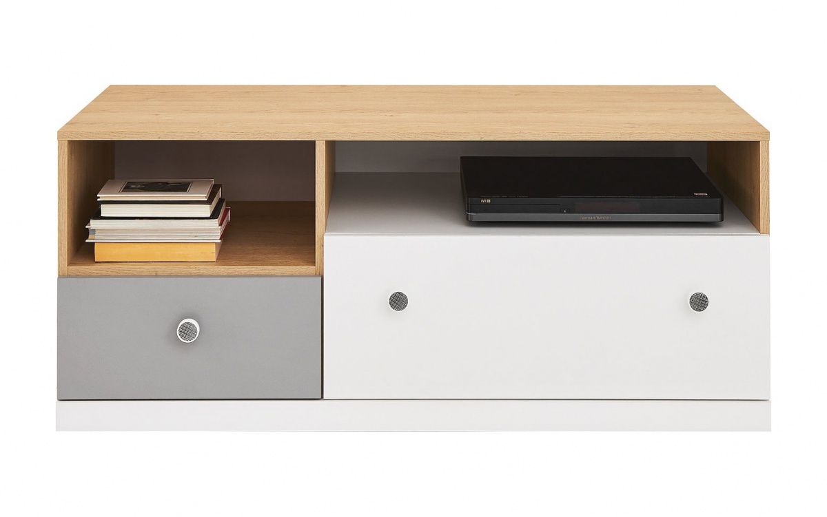 Tv stolík eragon - dub/biela/šedá. Jednoduchý a moderný design v neutrálnych tónoch, to všetko je praktický nábytok z kolekcie Eragon. Farba biela, šedá a dub biscuit je dobre kombinovateľná s inými farbami. Séria produktov Eragon je vhodná do dievčenskej alebo chlapčenskej izby. Nábytok je vyrobený z lamina hrúbky 16 mm ktorého veľkou výhodou je ľahká údržba, čo určite ocení mnoho z nás. Televízny stolík do študentskej izby? Prečo nie? TV je snáď v detských aj študentských izbách bežné médium. Kto v izbe televíziu nemá, alebo ju mať nechce, môže využiť TV stolík ako nízku komodu. Nízka TV komoda má v hornej časti otvorené police na uloženie napríklad knižiek alebo zariadení pre herné konzoly. V spodnej časti sú umiestnené zásuvky, ktoré sú plnovýsuvné. Televízny stolík môžete doplniť o ďalšie prvky nábytku z kolekcie Eragon môžete vybaviť celú detskú alebo študentskú izbičku.