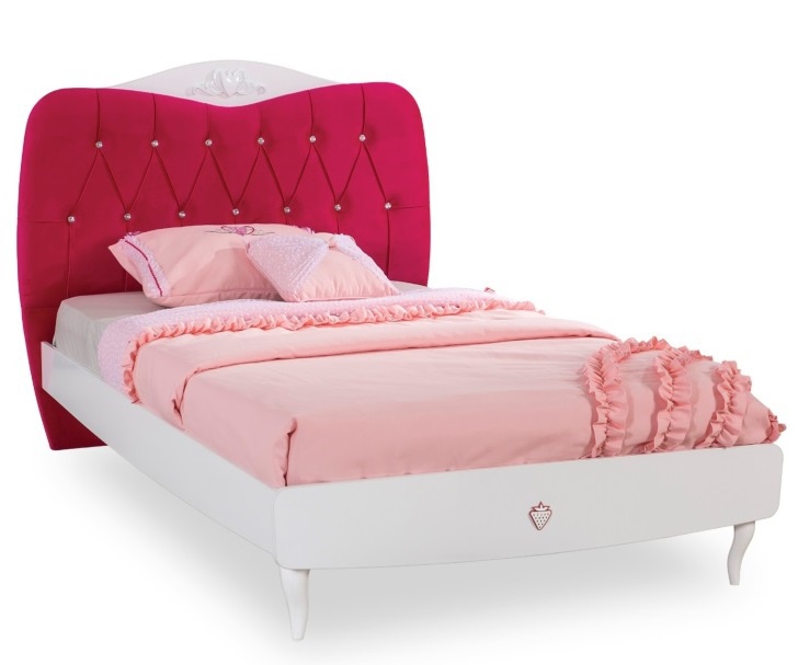 Posteľ bielej farby vo vysokom lesku obohatená o rubínové čelo sa javí nadčasovým štýlom a nadchne tak každú dievča. Kombinácia bielej a rubínovej farby pôsobí veľmi nežne, jemne, vkusne a elegantne. Moderný dizajn nábytku podčiarkujú zaujímavo tvarované nôžky. Ložná plocha postele je 120x200cm. Súčasťou postele je kvalitný doskový perforovaný rošt na spevnenom kovovom ráme. Matrac nie je súčasťou postele. Z nášho sortimentu môžeme odporučiť pružinový matrac Bamboo v rozmeroch 120x200cm, ktorý nájdete nižšie v súvisiacich produktoch.