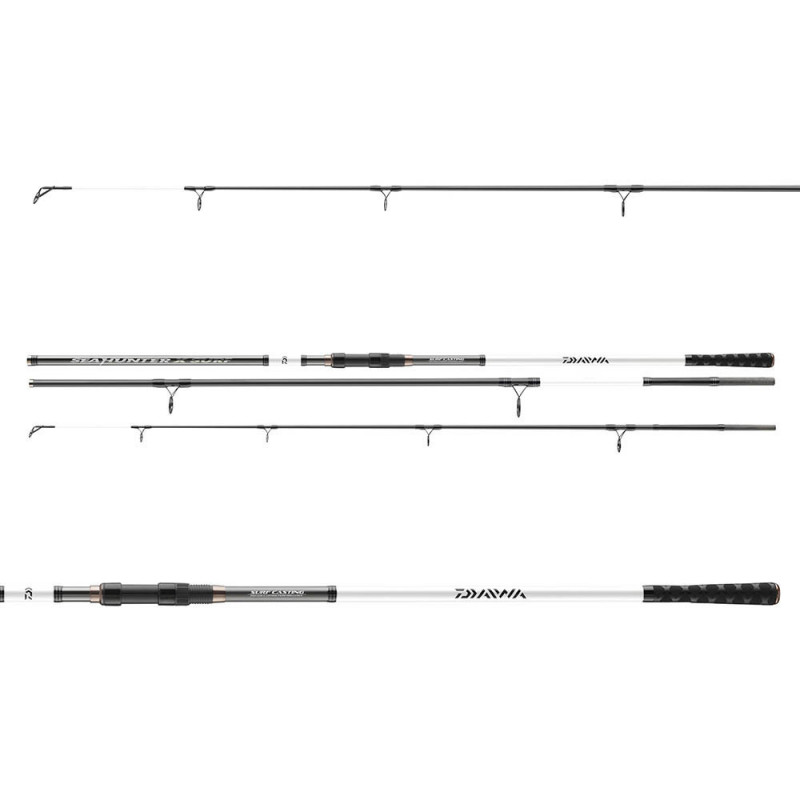 Daiwa prút seahunter x surf 4,5 m 100-250 g. Ľahké uhlíkové blanky HMC+ sa počas nahodenia dokonale ohýbajú a ľahko si poradia s ťažkými surfovými nástrahami, pričom poskytujú vynikajúce nahadzovacie vzdialenosti. Kvalitná zmršťovačka na konci rukoväte zaisťuje pevný úchop a pohodlnú manipuláciu pri nahadzovaní. Špička v tme svietiaca je o niečo mäkšia a indikuje aj citlivé zábery za zlých poveternostných podmienok av tme. Prúty sú osadené titán-oxidovými očkami a robustným sedlom navijaka DPS.