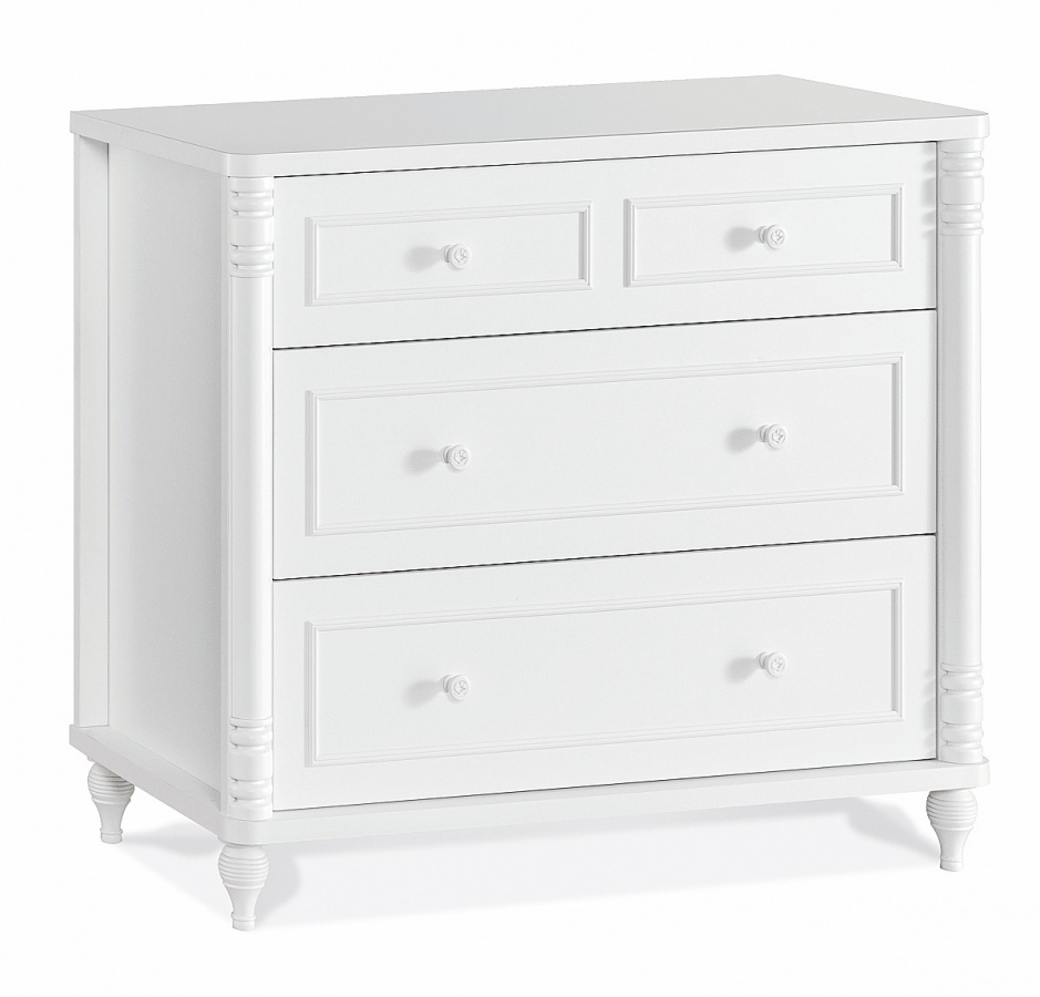 Zásuvková komoda luxor - biela. Dokáže vás chytiť za srdce prepracovaný, prekrásny nábytok, ktorý je doslova umeleckým dielom? Tak sa pripravte na poriadne chňapnutie, pretože je tu milá detská a študentská kolekcia Luxor. Spracovaná tak pôsobivo, že sa to krásnymi emóciami bude len hemžiť. Od úžasu nad prácou tvorcov, cez rozplývanie sa nad eleganciou, až po neskonalú radosť z umiestnenia v dievčenskej izbičke. Jedinečné prevedenie majú na svedomí štýlová biela farba, ktorá je symbolom čistoty a miesto nájde v každom interiéri, nádherné ozdobné línie a honosné nôžky. Atmosféra nábytku je romantická a bude hriať ako mamičku starajúcu sa o bábätko, tak mladú slečnu. Estetickú hodnotu sprevádza výborná funkčnosť a kvalitný materiál spočívajúci v lamine o hrúbke 18 a 25mm. Úchytky sú zhotovené z PVC.